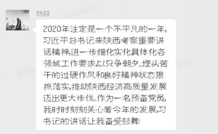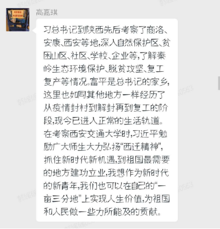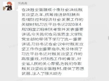 会后分别来自陕西西安市、宝鸡市、渭南市、商南县、富平县等十余名党员及预备党员自发撰写学习心得,并录制家乡疫情防控、经济恢复情况,向习总书记来陕西考察做出回馈,请总书记放心,并祝愿疫情早日结束,步入正轨。
