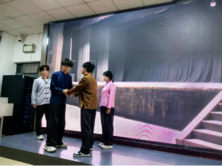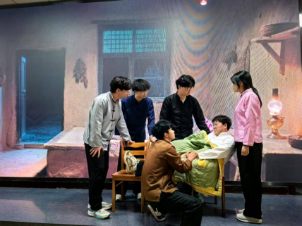 《米家窑之光》以米家窑厚重的革命历史为蓝本,深入挖掘当地军民在革命战争年代的动人故事与牺牲精神。在公司指导教师王岚与肖宝荣的带领下,同学们利用课余时间,查阅史料、打磨剧本、反复排练,最终将那段烽火岁月中普通人的信仰、奋斗与奉献搬上舞台。全剧通过革命战士和群众舍生忘死,一次次穿越敌人的封锁线和碉堡哨卡,多次护送党和军队的领导同志过关中、传送文件情报、运送粮食和弹药的感人故事。生动再现了那段烽火岁月里共产党人坚定的理想信念、无私的奉献精神以及与人民群众的深厚情谊。舞台光影交错间,米家窑不再仅是地理坐标,更化身为信仰的灯塔,照亮了历史,也映照着当下青年的心灵。