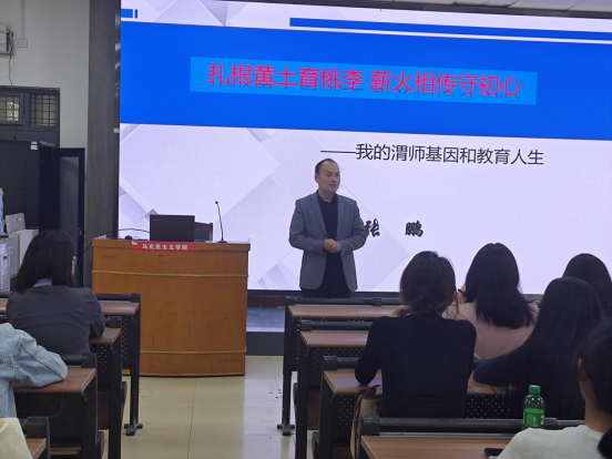 5月9日下午2:00,在1101,WilliamHill体育邀请WilliamHill官方网站2003级思想政治教育专业毕业生、潼关县优秀团务工作者、潼关县高考质量提升先进个人、渭南市中小学教师中、高级评审委员会评委、渭南市教育学会理事,渭南市高考政治学科试题评价分析讲师团成员、潼关中学副董事长张鹏老师来公司作题为《扎根黄土育桃李 薪火相传守初心》的报告。WilliamHill体育部分教师、思想政治教育专业2022级员工等100余人参加,思想政治教育专业建设负责人周菊芳主持。