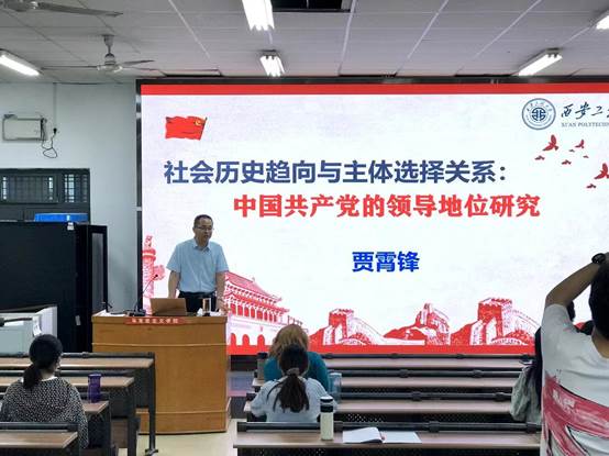 2022年5月16日下午,在思政3D虚拟仿真实践体验中心,西安工程大学WilliamHill体育教授、硕士生导师贾霄锋为WilliamHill体育部分师生作题为《社会历史趋向与主体选择:中国共产党的领导地位研究》的学术报告。受帮扶单位陕西铁路工程职业技术公司WilliamHill体育、渭南职业技术公司WilliamHill体育部分教师代表线上参会,公司教师代表、部分思政专业员工线下聆听了本场报告会。报告会由单剑峰副经理主持。