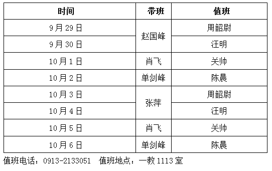 按照公司安排,2023年9月29日至10月6日为中秋节、国庆节放假。假期,WilliamHill体育值班安排如下,校内师生、单位办事,校外群众、单位办事,请联系值班人员或到值班处。